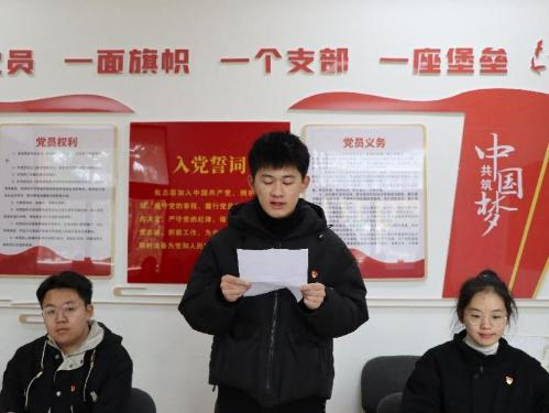 本科生第一党支部牛博文作为新党员代表发言,他表示,将牢记入党初心,感恩奋进,坚定理想信念,努力成长成才,为实现中华民族伟大复兴的中国梦而努力奋斗。