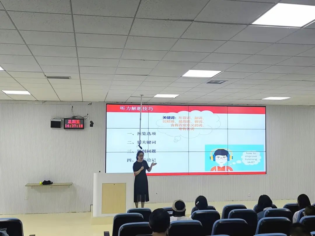 大学外语第二教研室负责人肖菊老师主讲,她以"四六级听力解题技巧"为主题,为同学们带来了一场内容丰富、实用性强的讲座。