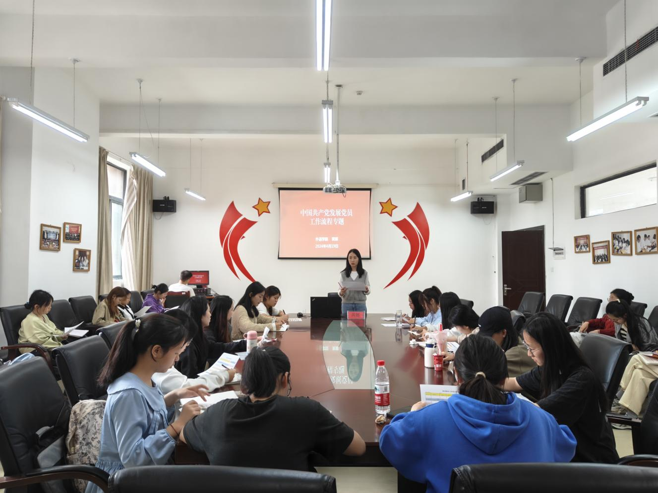 副科级专职组织员在励学楼301会议室为2024年春季入党积极分子培训班全体学员作“中国共产党发展党员工作流程”专题讲座。