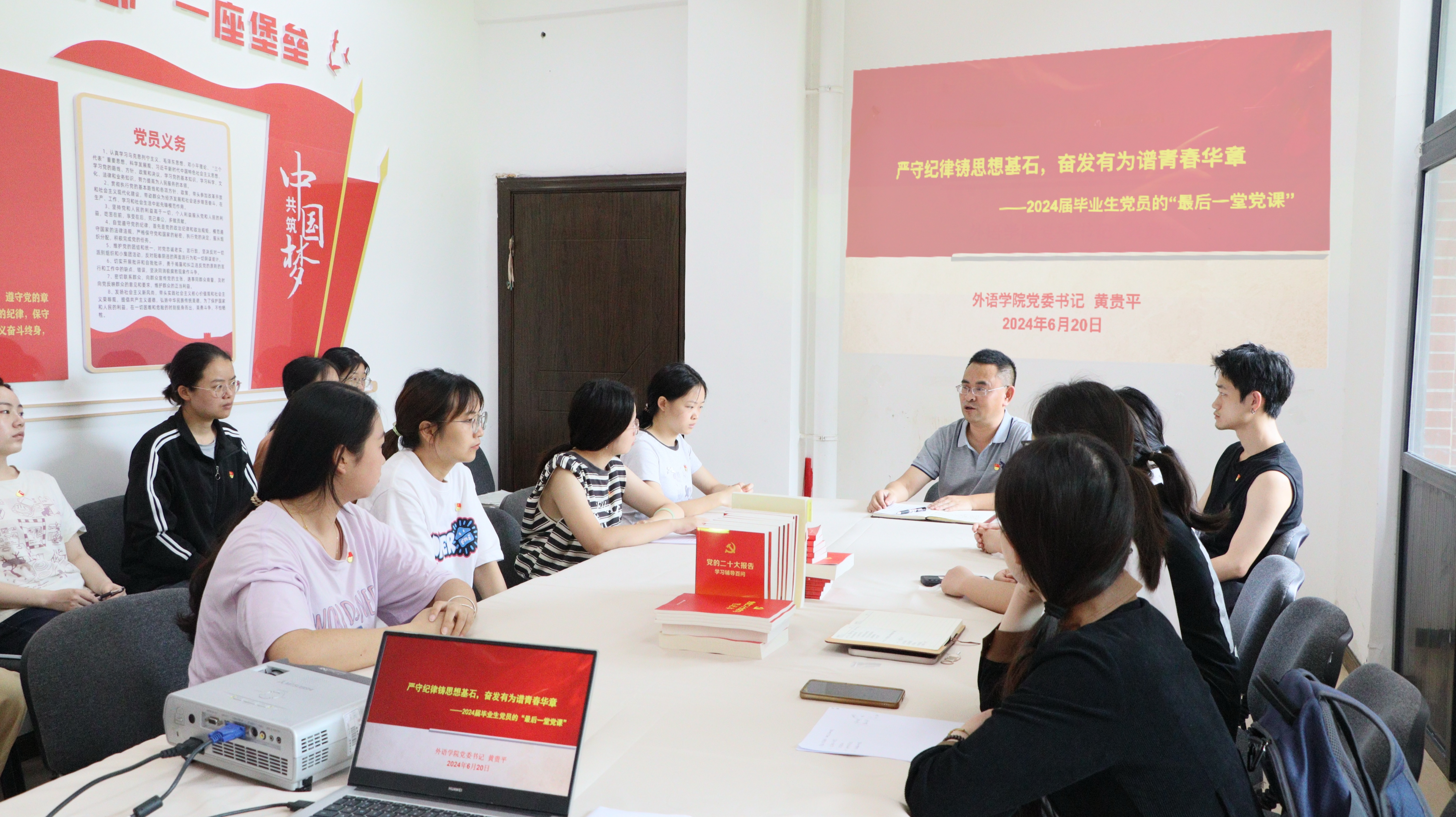 黄贵平以“严守纪律铸思想基石,奋发有为谱青春华章”为题为毕业生党员讲授最后一堂党课。他从政治纪律、组织纪律、廉洁纪律、群众纪律、工作纪律以及生活纪律六个方面,详细介绍了党员需要遵守的相关党规党纪,并结合案例告诫大家违纪的危害性和严重后果,引导毕业生党员们明确是非界限、清楚自律标准、守住行为底线。同时对毕业生党员提出两点期望:一是始终牢记自己的党员身份和职责使命,不忘初心、牢记使命,听党话跟党走;二是勇于担当、积极作为、努力奋斗,为党和人民的事业贡献自己的力量。