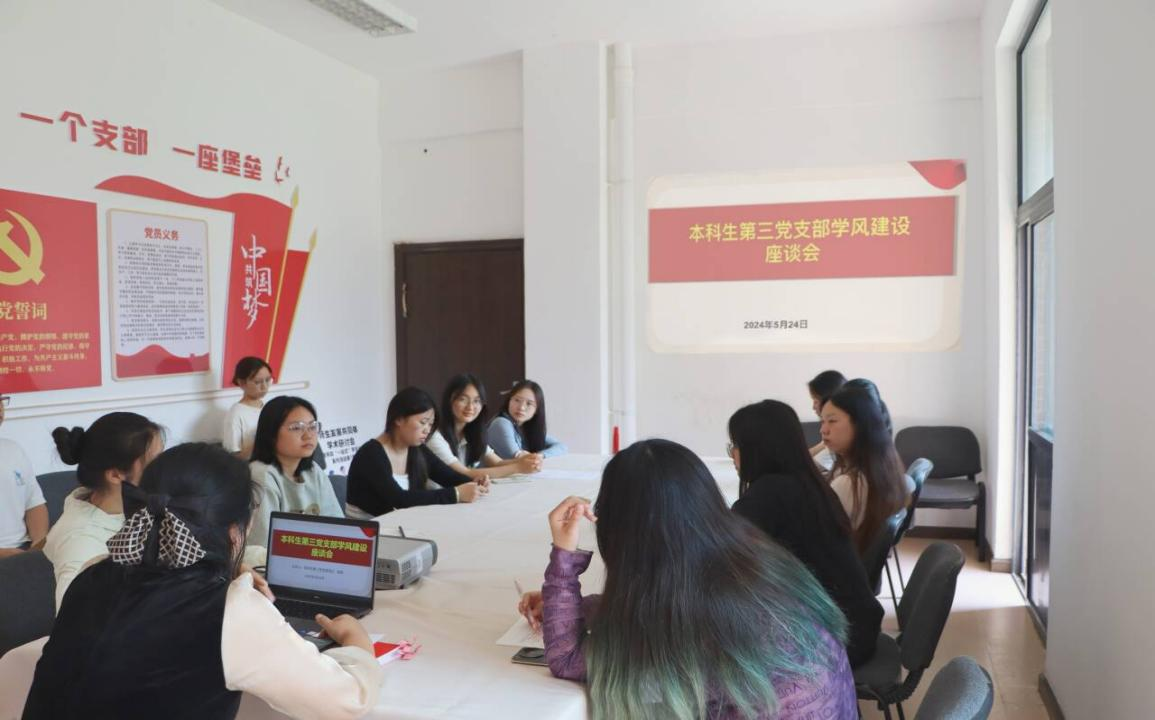本科生第三党支部立足“一站式”学生社区,结合支部品牌建设“聚焦学风建设 有我+”,于2024年5月24日下午,在玉兰苑一栋226党团会议室召开学风座谈会。本科生第三党支部书记陈欢、全体党员以及发展对象参加座谈会。