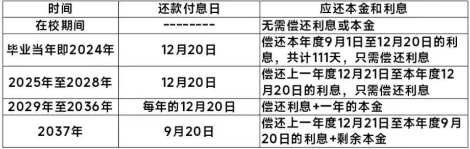 按年计收,起息日为毕业当年9月1日,结息日为每年的12月20日(最后一年为9月20日),次日为扣息日,节假日不顺延。