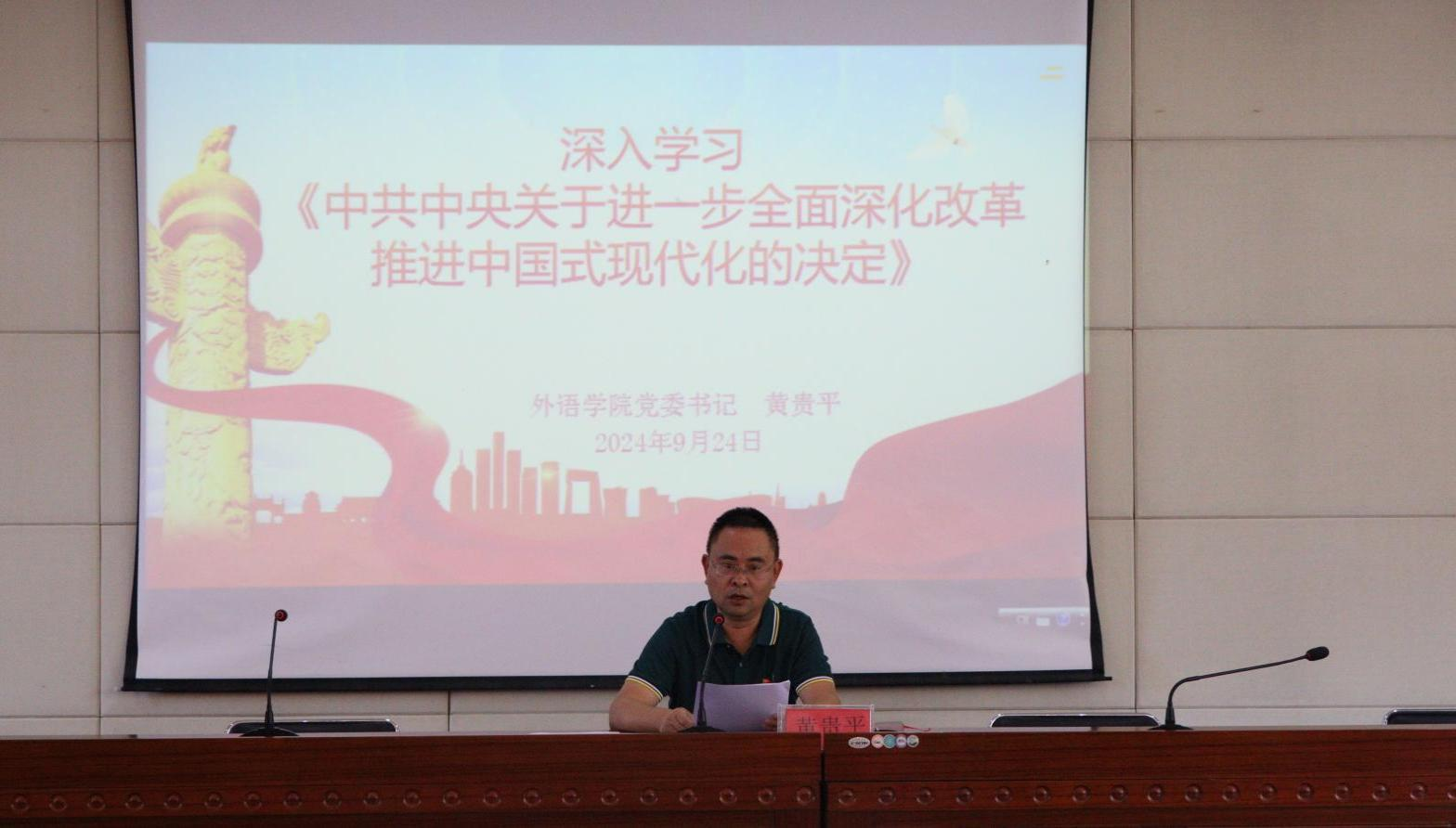 开班典礼结束后,黄贵平以《深入学习<中共中央关于进一步全面深化改革、推进中国式现代化的决定>》为主题,开展了党的二十届三中全会精神宣讲。黄贵平从“进一步全面深化改革推进中国式现代化的重大意义和总体要求”、“经济、政治、文化、社会、生态文明、国家安全、国防和军队等方面部署改革”、“加强党对改革的领导、深化党的建设制度改革、党风廉政建设和反腐败斗争”等三个方面进行了深入阐述。
