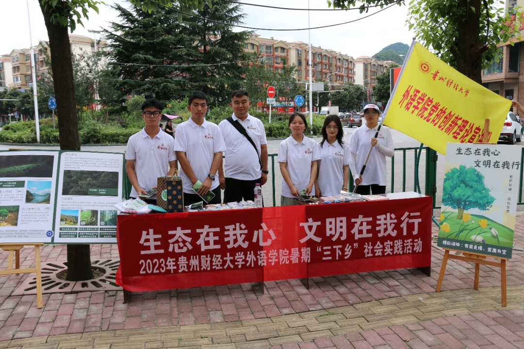 “三下乡”实践队在夏云镇上开展了金融知识宣传和党的创新理论宣讲活动。同学们走上街头摆摊设点,通过发放传单和面对面讲解等方式,向当地群众普及金融知识和宣讲习近平生态文明思想。