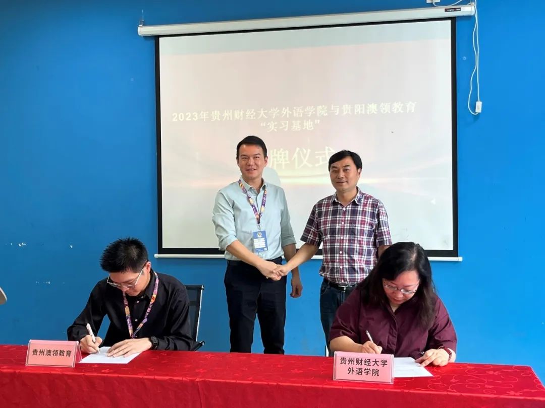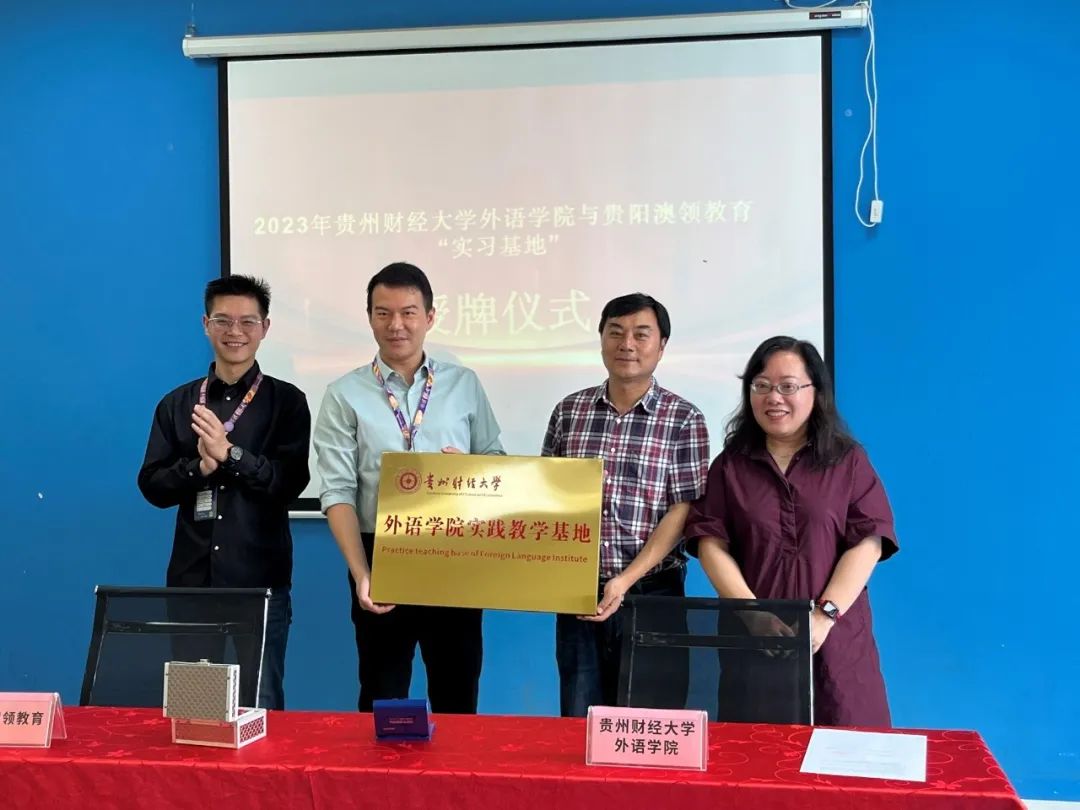 赴贵州澳领教育咨询有限公司举行实习基地授牌仪式。党委书记胡张林、副院长雷晴岚、英语系副主任王景洁,英语系教师代表张春、吴艳参加了此次会谈。
