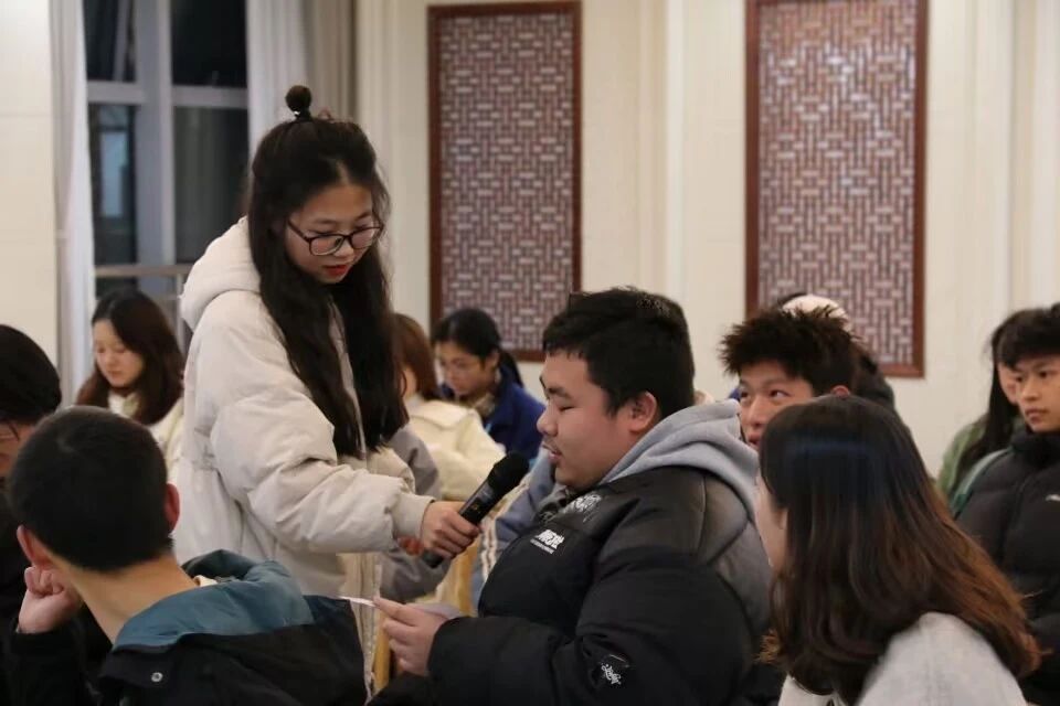 随后,主持人将一些英文小纸条分给同学们,同学们依次站起来读自己抽到的纸条上的内容,并在接下来的游戏中使用这些英语表达。或许上面的文字本没有温度,但同学们却为它们赋予了独一无二的情感,相信同学们的压力也会在一句句暖心的话语中渐渐化解。