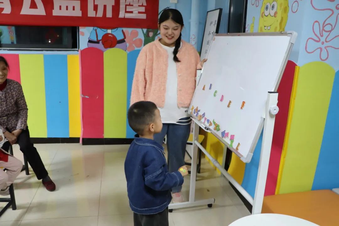 课堂上,志愿者“小老师”们首先通过ABC身体操和象形字母教学启发小朋友们对于英文字母学习的想象力,同时穿插举手抢答和“我教大家读英语”等教学小活动帮助小朋友们加深对英文字母的记忆力。