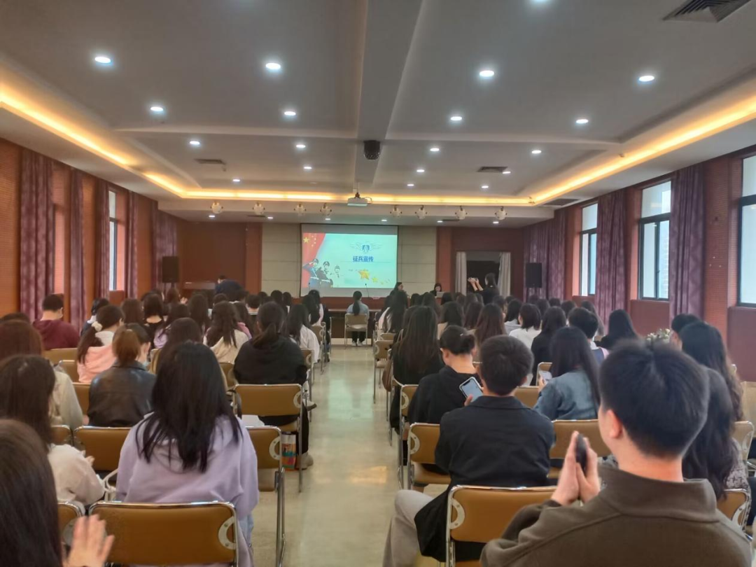 会上,汪欢副书记首先向同学们讲述了全民国防的重要意义,她从征兵工作的意义、基本条件、组织流程、优待政策四个方面详细解读了国家对应征入伍服义务兵役的高校学生的资助、经济补助待遇及退役后升学等方面政策。她强调,关心国防建设是青年大学生义不容辞的责任,保家卫国是我们的神圣职责和义务。希望广大同学抓住机遇,积极响应国家号召,投身军营报效祖国,自觉将个人理想融入国家发展,让青春在军营的历练中、在现代化的强军建设中奉献青春热血。