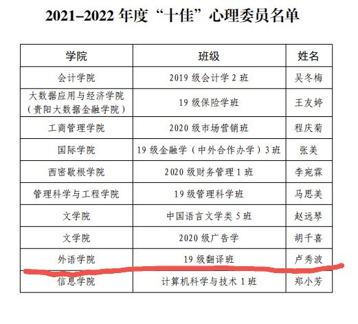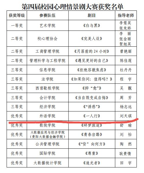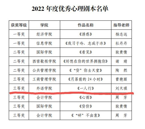 近日,在学校举办的第十一届“心梦想·心成长”为主题的心理健康文化节系列活动中,nba赔率 辅导员老师刘天琪指导的《一人行》荣获2022年度优秀心理剧本三等奖、第四届校园心理情景剧大赛优秀奖,2019级翻译班卢秀波同学荣获 2021-2022年度“十佳”心理委员。(撰稿:申恒)