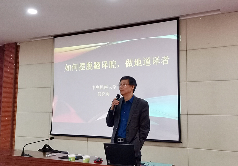 何克勇教授以中国目前的翻译现状为切入点,以自己及其他译者的翻译作品为例子,具体阐述译者在翻译过程中如何摆脱翻译腔,做地道译者。首先,何克勇教授具体介绍了翻译腔的八种表现形式,分别是:词不达意,自相矛盾,指代不清,摹状失当,语无伦次,不知所云,连接含糊,比拟出格。接着,何克勇教授继续阐明要避免以上翻译腔,译者应根据以下四个原则与方法进行翻译,分别是:“得意忘形”,切分英文句子,调整英文顺序,通过阅读与写作来提高汉语表达能力或练习写作等。为了加深在座师生对这四个原则与方法的理解,何克勇教授在讲座上展示了大量的英汉翻译例句,邀请同学自行翻译,并与译文进行对比分析。最后,何克勇教授指出翻译腔是翻译大忌,要成为言简意赅、表达地道的译者,必须牢记“得意忘形”的原则,运用切分,打乱原文语序,重新按照汉语的逻辑来表达。何克勇教授也鼓励在座师生多读书,读好书,为英汉翻译打下夯实的语言基础。