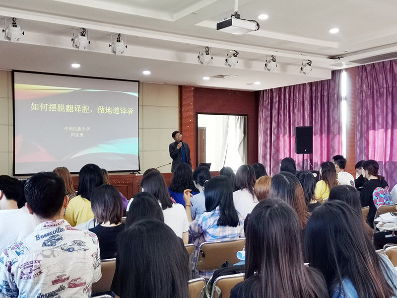 何克勇教授的讲座生动诙谐,气氛热烈。在讲座的互动环节,同学们踊跃提问,何克勇教授耐心地解答,就中国文化对外传播,译者是该选择归化还是异化,如何界定四字词过度翻译这一系列问题,何克勇教授提出了很好的建议。此次讲座拓宽了与会师生的视野,受益匪浅。