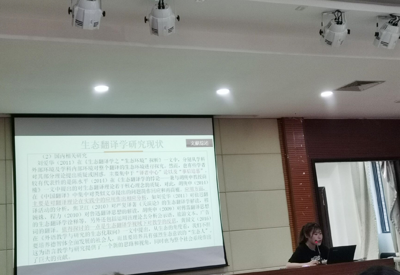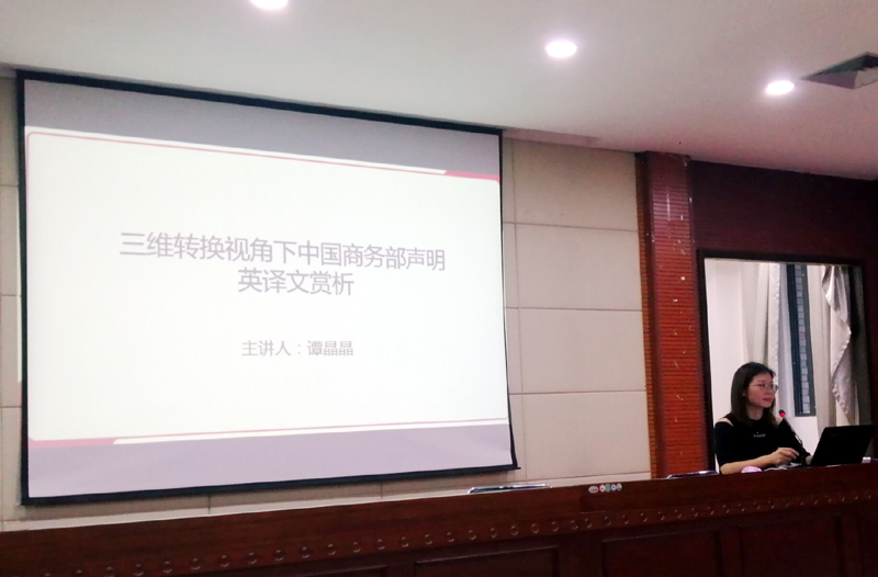 谭晶晶围绕“三维转换视角下中国商务部声明英译文赏析”,通过对商务部翻译文本深入浅出地分析,使同学们在三维转换的基础之上对外宣翻译文本有了更多的理解。