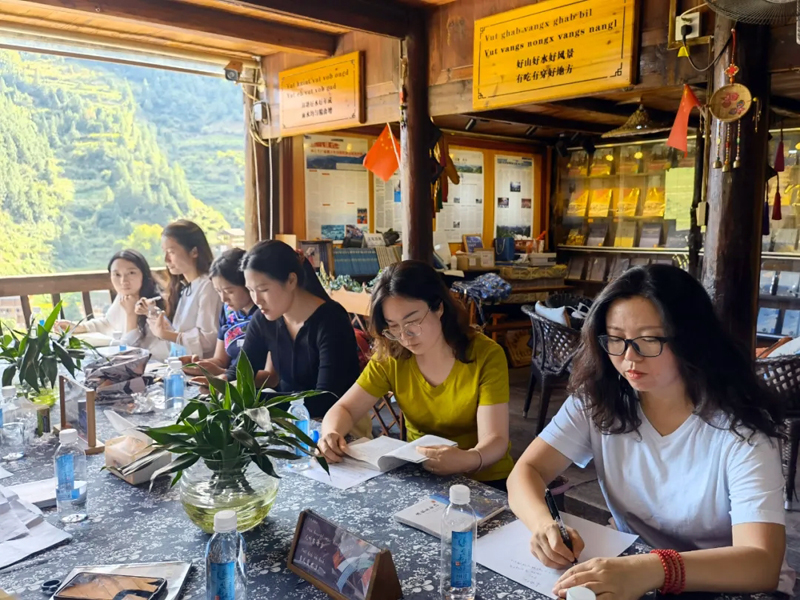 会上,李天翼教授介绍了西江千户苗寨的现状,并由助理研究员对西江千户苗寨文化研究院的主要工作情况进行了汇报。随后,同学们针对翻译过程中遇到的问题进行了发言和讨论。同学们表示之前对苗族文化较为陌生,如“蝴蝶妈妈”、“妹傍留”和“鼓藏”等民族特色词,故在翻译过程中,着重于还原民族文化的内涵和面貌,展示中华文明的美丽,传播世界文明成果。此次西江之行,实地调研让同学们更直观地感受少数民族文化的魅力,更深刻地体会到“以文载道、以文传声、以文化人”的内涵。
