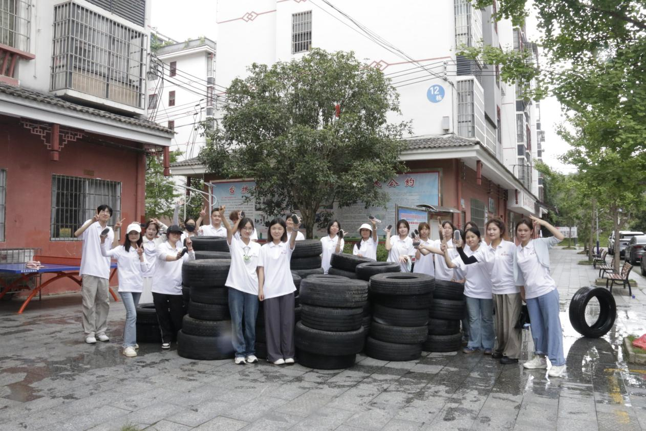在基层服务中,实践队积极开展社区环境改善行动。队员们齐心协力清洗了100余个废旧轮胎,后续这些轮胎将被涂上各色的油漆并用作彩色花盆,为美化社区、增添绿意做好准备,既环保又实用。