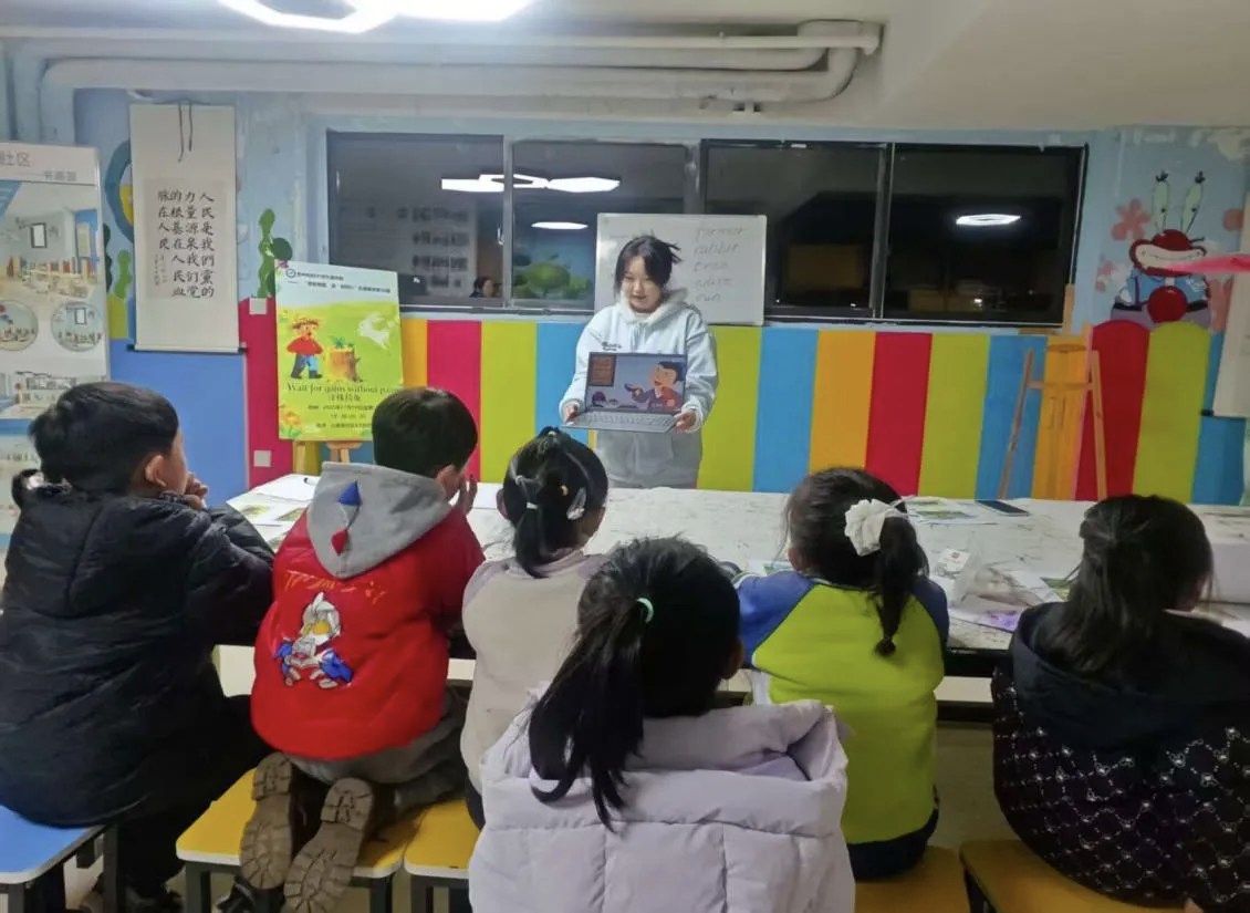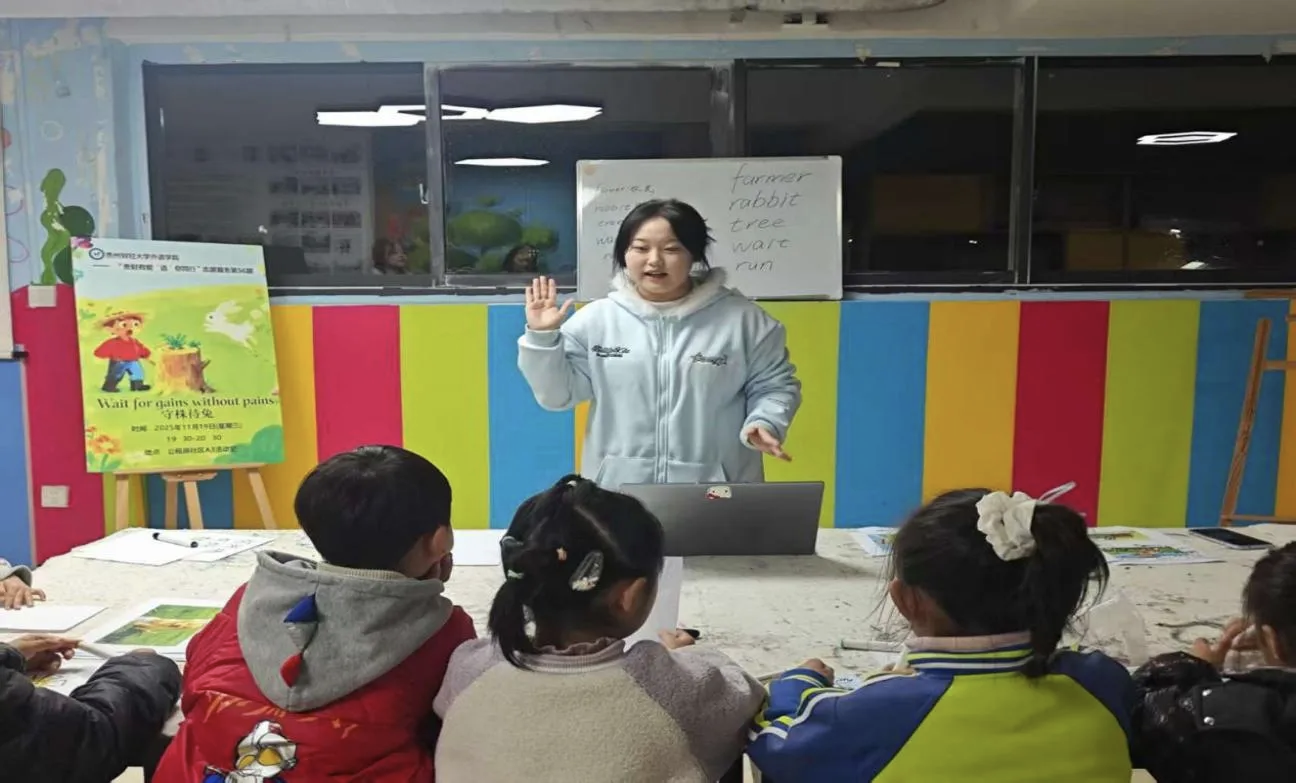 “贵财有爱‘语’你同行第56期活动在贵州财经大学西校区公租房社区A1活动室顺利开展。志愿者王承菊、冯周、陈光艳、刘汉燊共同为小朋友们带来了一堂别开生面的英语趣味课堂。本期活动以“Wait for gains without pains”(《守株待兔》)为主题,巧妙地将经典寓言与趣味游戏相融合,让孩子们在亲身体验中读懂寓言内涵,在快乐互动中感受英语魅力。