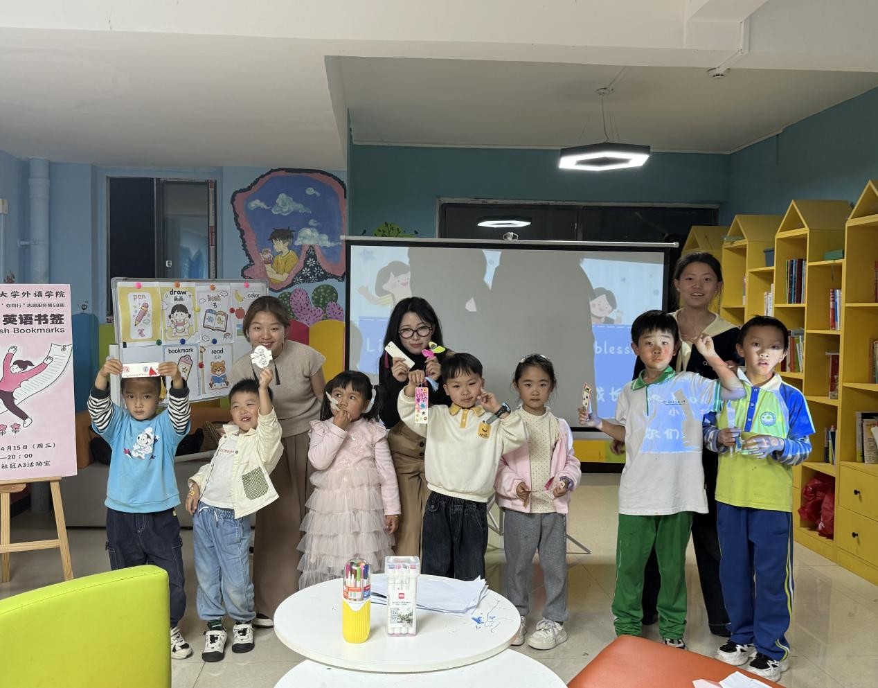 活动尾声,孩子们骄傲地举起自己制作的书签,对着镜头露出了无比灿烂的笑容。志愿者用英文送上了温暖的告别祝福:“Hope you love reading, and love your bookmarks!”这一晚,他们带回家的不仅是一枚小小的书签,更是一颗热爱英语、热爱阅读的种子。