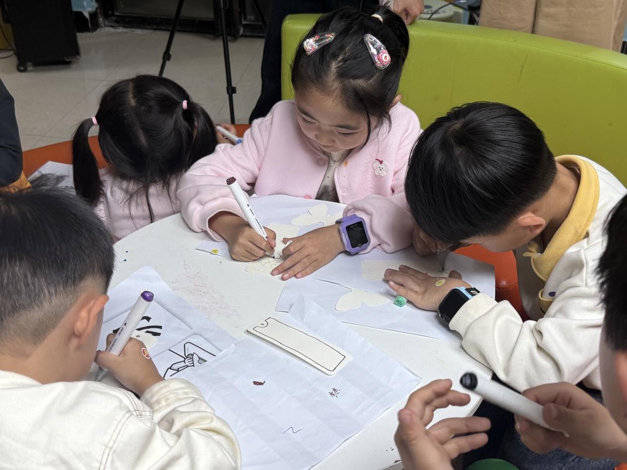 最令人期待的动手环节来啦!书签、画笔、贴画分发下去,在熟悉的英文指令的引导下,孩子们化身小小设计师。爱心、花朵、星星……脑洞大开的元素被融入方寸书签之间。更让人惊喜的是,孩子们不仅能画,还能讲!他们勇敢地举起作品,尝试用刚学会的英文词汇介绍自己的设计。动手能力与口语表达在这一刻实现了无缝衔接。
