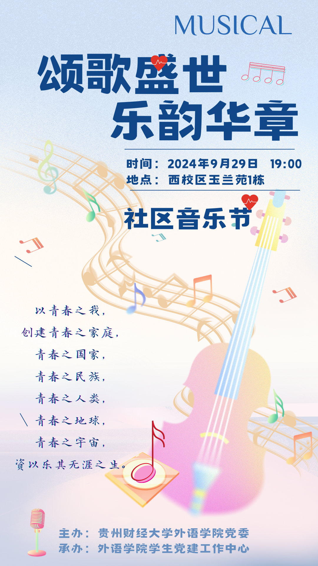 没错,我们“小外”悄悄去筹备一场精彩的音乐盛宴啦!——“颂歌盛世,乐韵华章”社区音乐节。