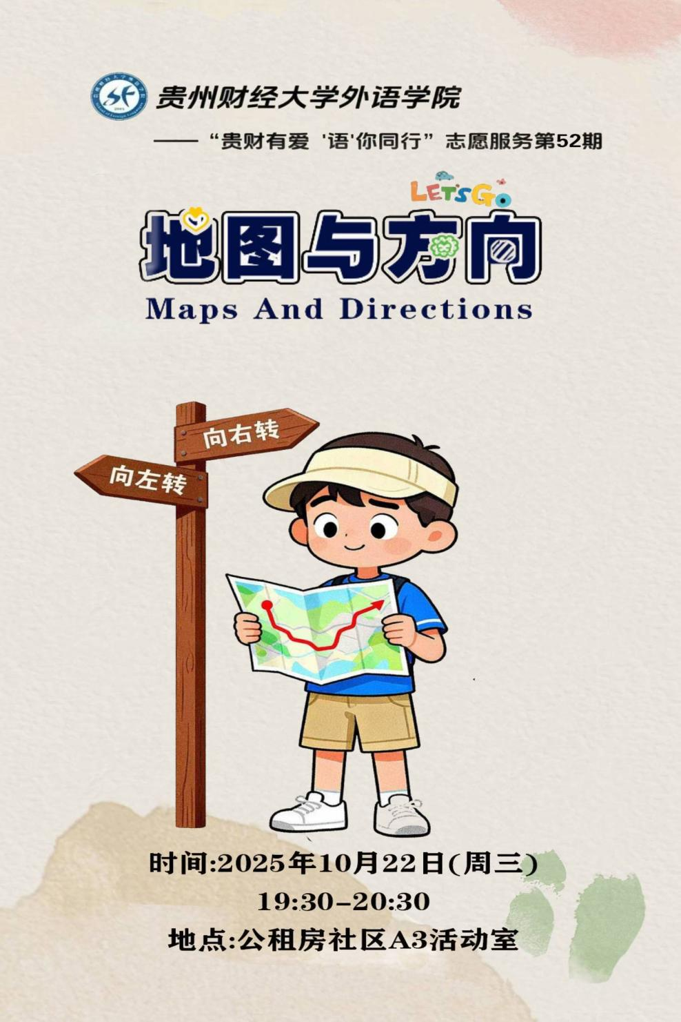 “贵财有爱‘语’你同行”志愿服务第52期志愿活动来啦!本期志愿服务以小小探险家——“地图与方向”为主题,用巨大的想象力破解地图与方向的密码,开启一场充满惊奇的寻宝之旅!