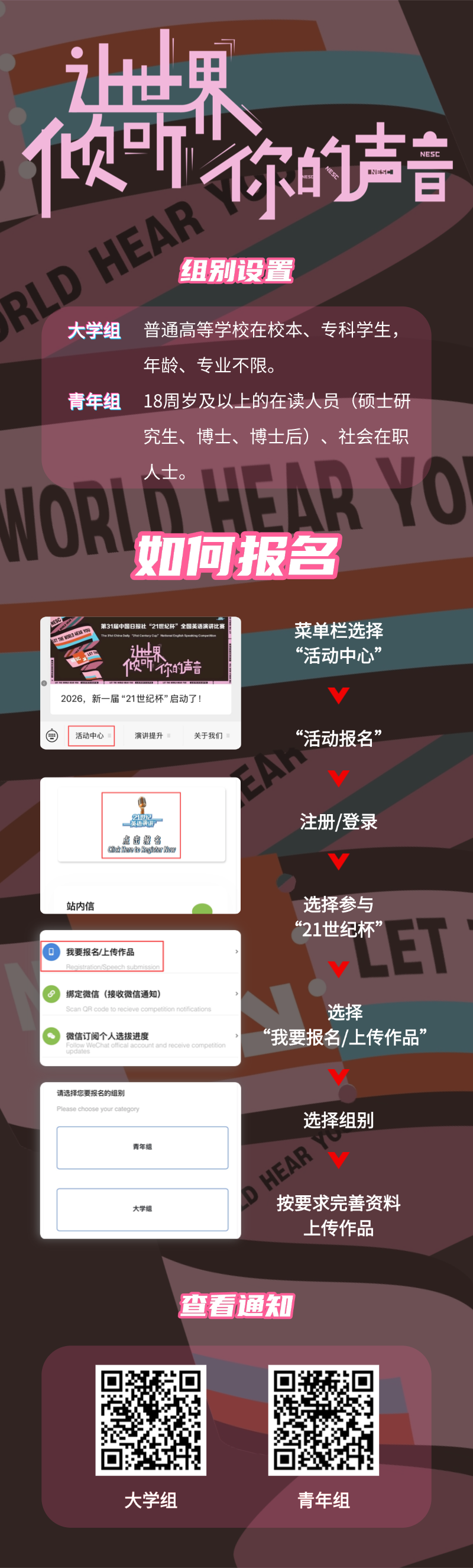 大 学 组:The 31st China Daily “21st Century Cup” National English Speaking Competition/第31届中国日报社“21 世纪杯”全国英语演讲比赛