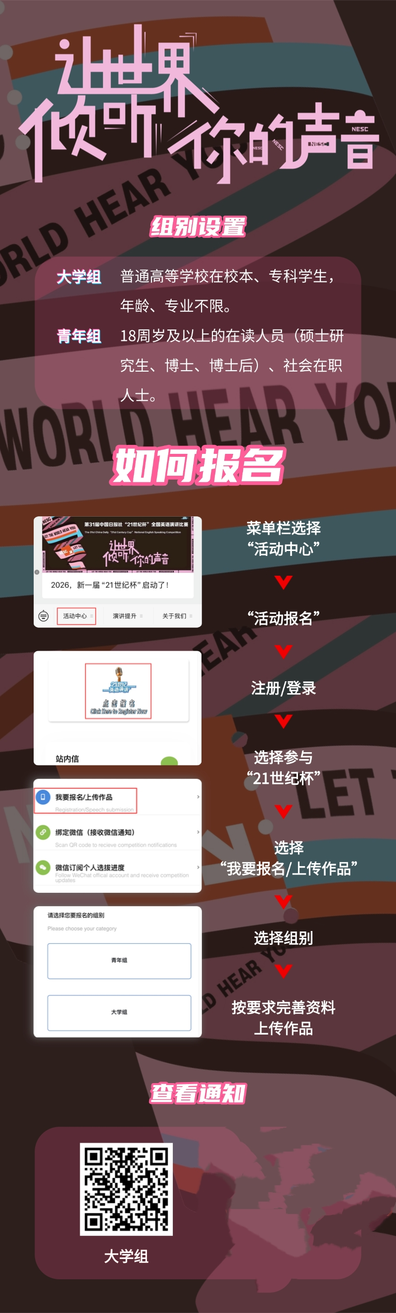大学组:The 31st China Daily “21st Century Cup” National English Speaking Competition/第31届中国日报社“21 世纪杯”全国英语演讲比赛