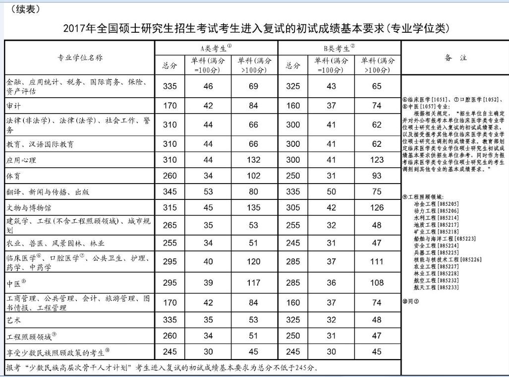 2017年全国硕士研究生招生考试考生进入复试的初试成绩基本要求(专业学位类)