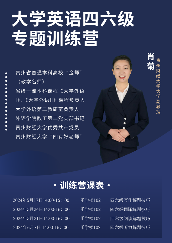 将举行学风建设系列活动——大学英语四六级专题训练营,专题针对四六级考试的写作、阅读、翻译、听力四种题型及解题技巧进行辅导训练。旨在提升学生的四级考试技巧和英语综合运用能力,能够更好的应对考试,取得优异成绩。
