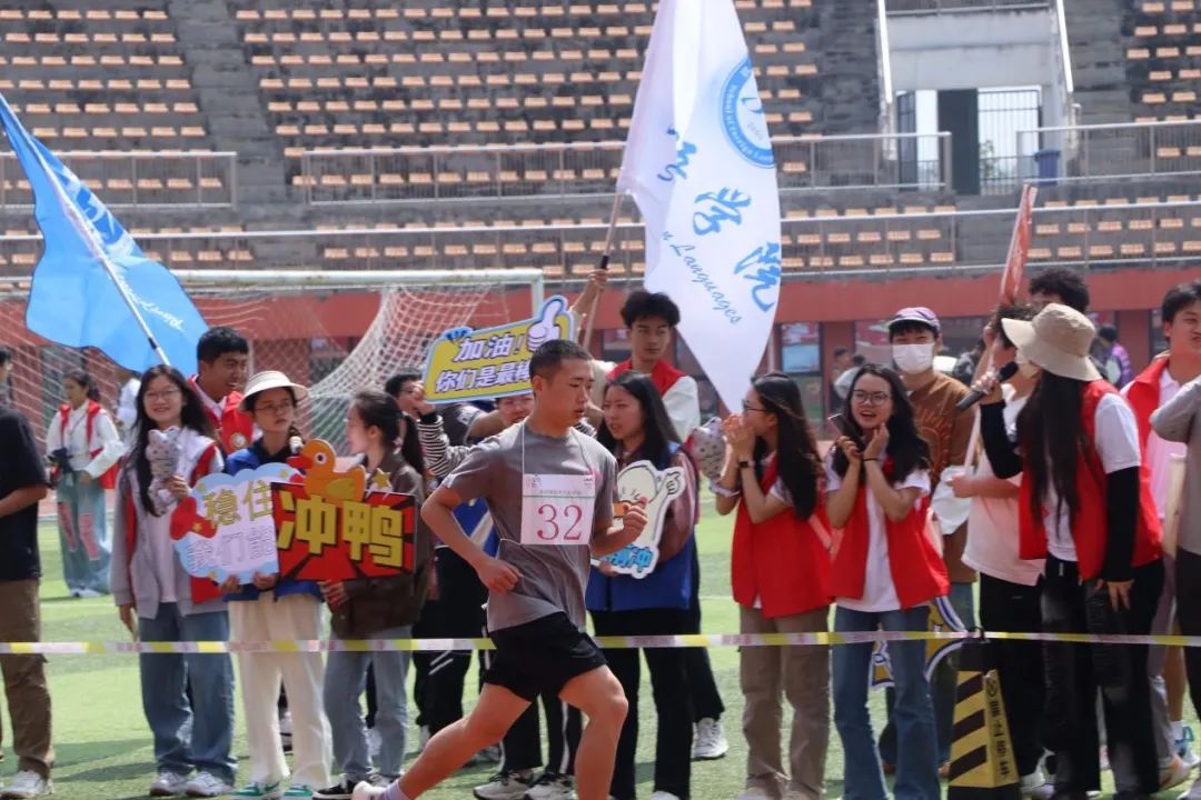 万米跑道上,浓浓外院情。在男子一万米比赛中,外院学子步履坚定地在跑道上奔跑。高空悬挂的太阳是前进方向的指引,挥洒的汗水是在比赛中奋力拼搏的见证,耳边回荡的加油呐喊是奔跑的动力。外院学子们接力举起旗帜,陪伴着运动员奔跑,完成了这一万米征程。此刻,比赛成绩已不再重要,我们为之喝彩的是运动员坚持不懈的拼搏毅力,是外院学子们团结友爱的生动写照,浓浓的外院情谊一直萦绕在我们心间。