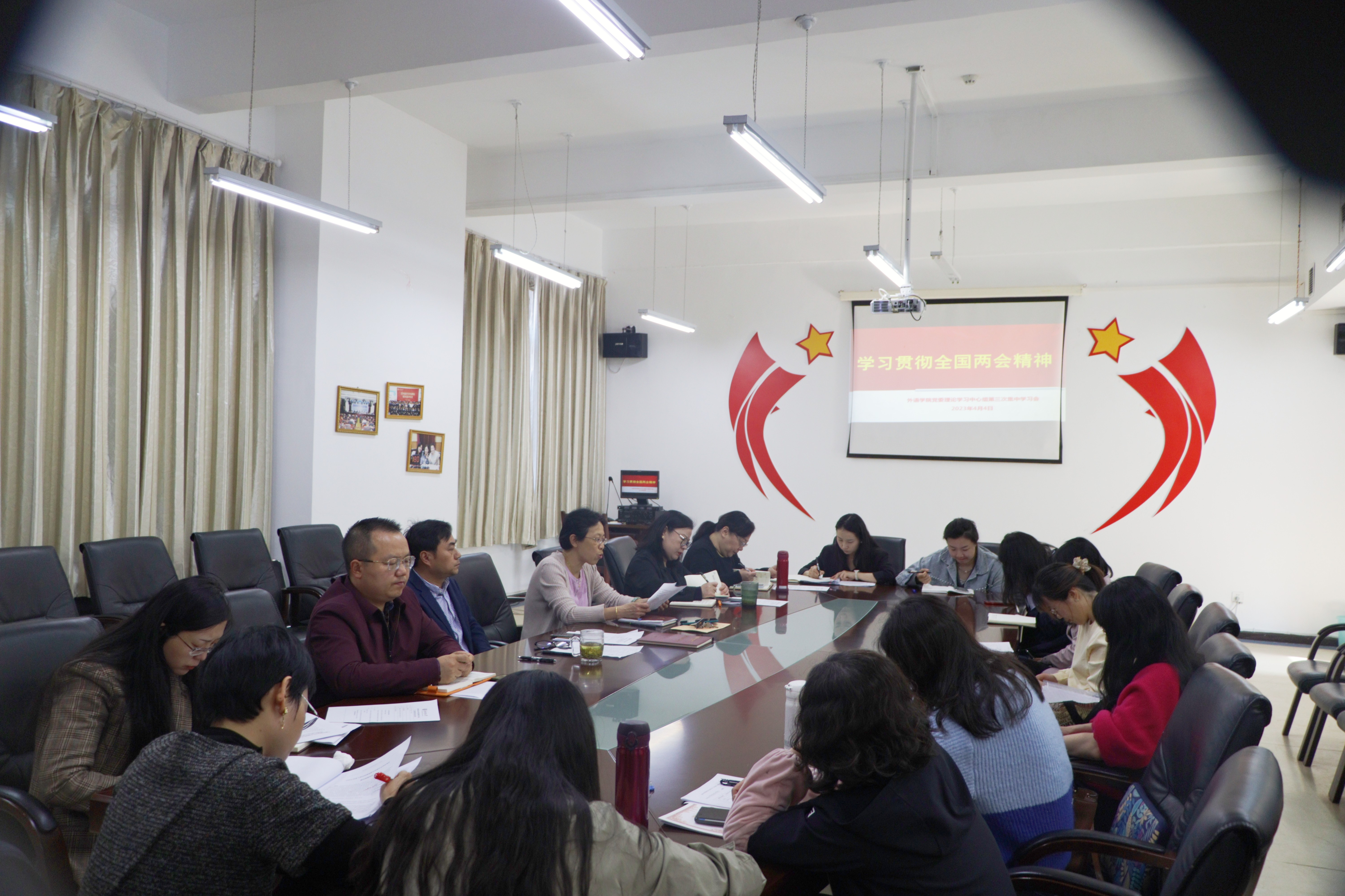 教职工将两会精神转化成教书育人的动力,推动我院教育事业高质量发展,4月4日上午,院党委理论学习中心组在励学楼301会议室召开专题学习会,传达学习全国两会精神。院领导、党支部书记、科级干部及系部主任出席会议,院党委书记胡张林主持会议。