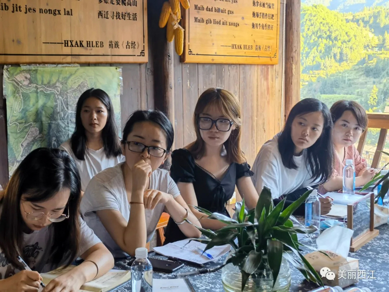 会上,李天翼教授介绍了西江千户苗寨的现状,并由助理研究员对西江千户苗寨文化研究院的主要工作情况进行了汇报。随后,同学们针对翻译过程中遇到的问题进行了发言和讨论。同学们表示之前对苗族文化较为陌生,如“蝴蝶妈妈”、“妹傍留”和“鼓藏”等民族特色词,故在翻译过程中,着重于还原民族文化的内涵和面貌,展示中华文明的美丽,传播世界文明成果。此次西江之行,实地调研让同学们更直观地感受少数民族文化的魅力,更深刻地体会到“以文载道、以文传声、以文化人”的内涵。