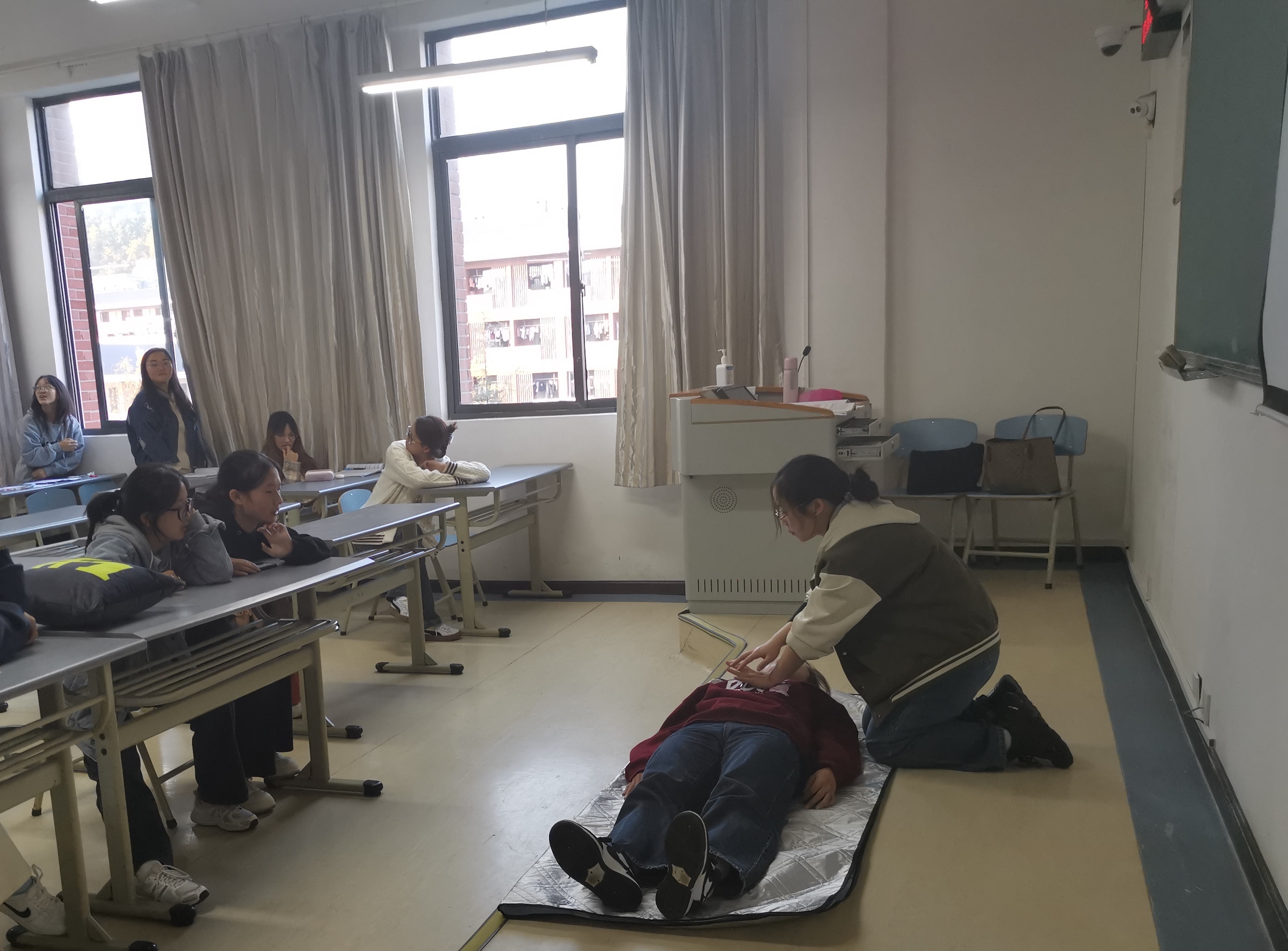 (图为22级商务英语的劳动安全专题讲解中的心肺复苏与人工呼吸)