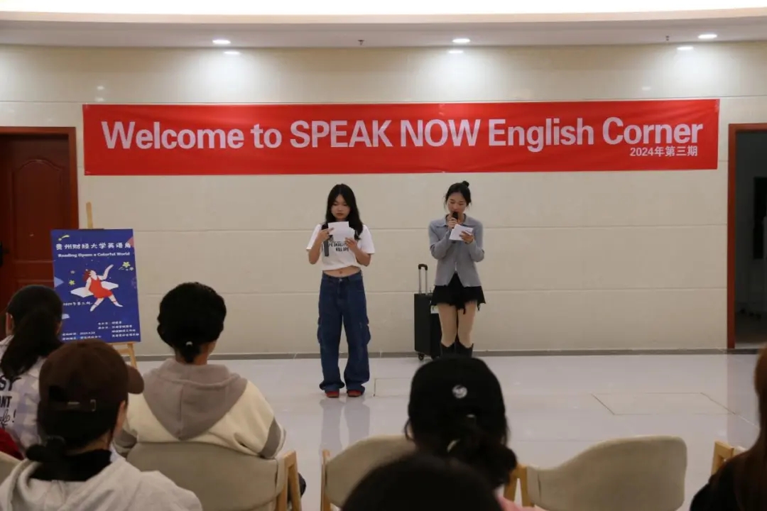 团委、明格翻译工作站、英语爱好者俱乐部共同承办的2024年第三期“Speak Now”英语角—世界读书日专题活动于学生活动中心顺利开展。此次英语角的主题为“Reading Opens a Colorful World”。“书中自有黄金屋,书中自有颜如玉”,本期英语角活动展现了每位贵财学子在书本里畅游的快乐以及他们的读书分享。
