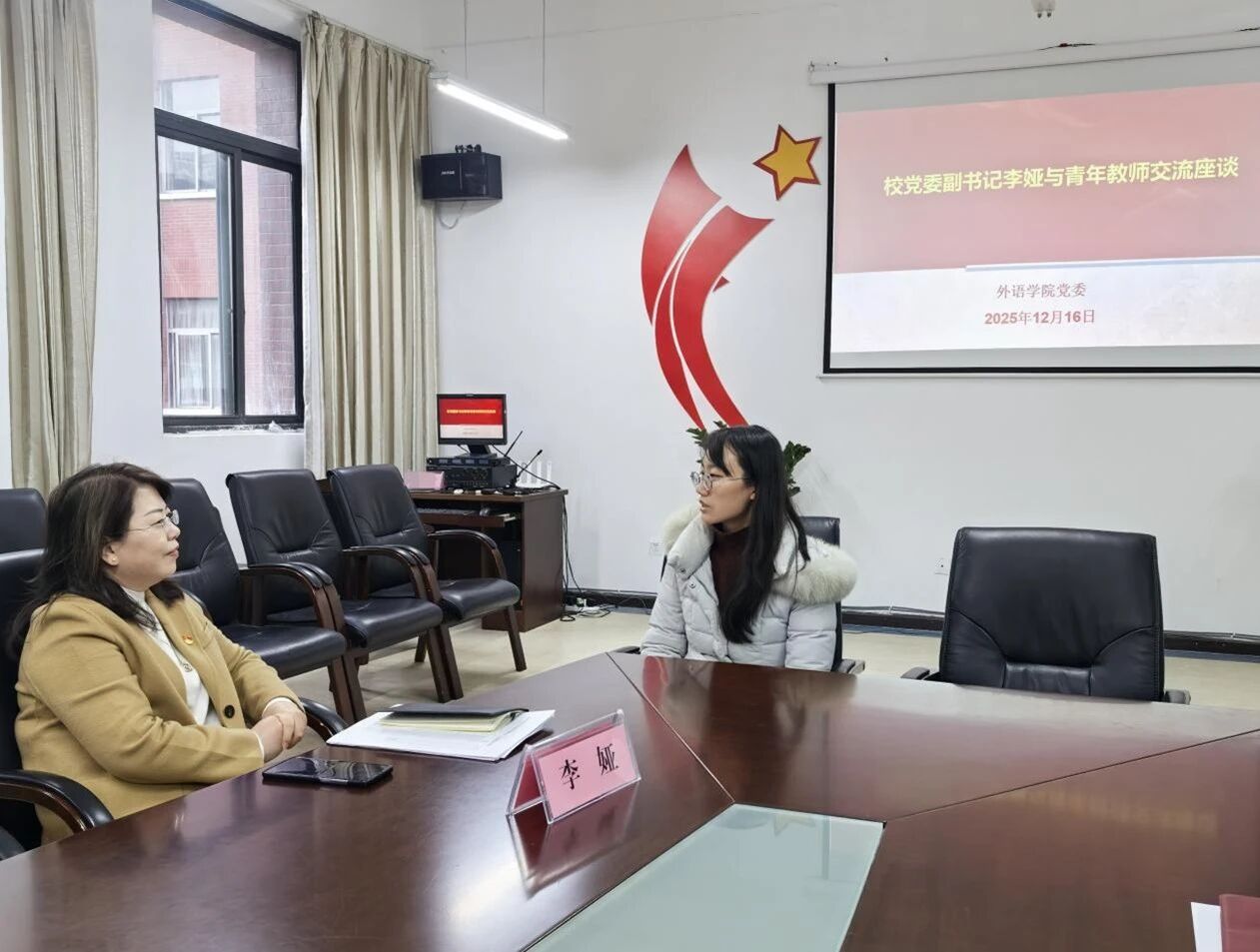 李娅细致询问了李颖杰老师近期教学与科研情况,并对其现阶段工作予以肯定。她指出,青年教师是学校发展的生力军,既要站稳讲台、精研教学,也要勇于投身科研探索,实现教学与科研的相互促进、双向提升。她强调,学校将持续构建有利于青年教师成长的制度机制,支持大家以扎实的学术与教学成果,稳步实现职称晋升。
