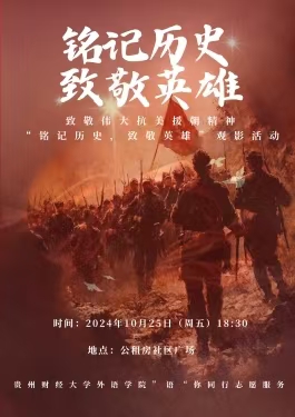 一站式”学生社区先锋值班室将举办“致敬伟大抗美援朝精神”观影活动。通过集中观看红色电影《长津湖》,铭记历史,致敬英雄,缅怀那些“最可爱的人”。