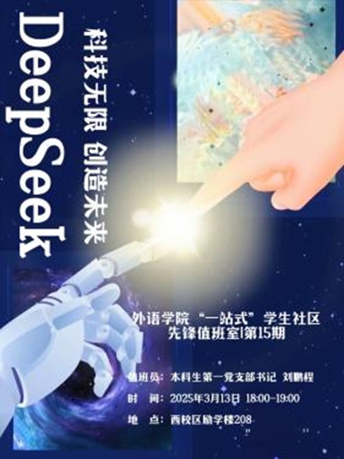 AI正在重新定义我们获取知识的方式,它让语言学习更高效,让跨文化交流更顺畅,但技术的双面性也带来深刻思考:如何在效率与伦理之间找到平衡?未来的语言学习将何去何从?DeepSeek不仅是技术的飞跃,更是学习方式的革命!从智能翻译到个性化学习路径,这场【DeepSeek科普课堂】将带你直面AI时代的学习变革,探索教育与科技的无限可能!本期“一站式”学生社区先锋值班室将为大家深度介绍 DeepSeek,并分析探讨AI如何赋能教育,以及对语言专业学习有哪些帮助和挑战。同学们可提前用手机下载好“DeepSeek”app,便于在课堂中互动实践演练哦。