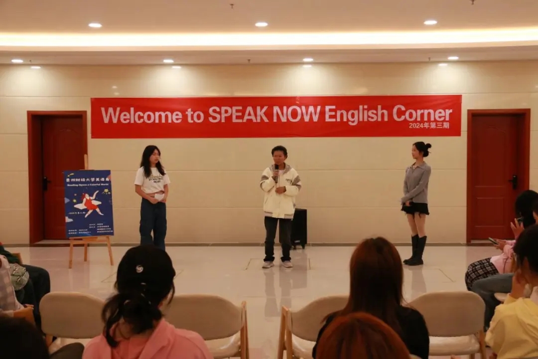 团委、明格翻译工作站、英语爱好者俱乐部共同承办的2024年第三期“Speak Now”英语角—世界读书日专题活动于学生活动中心顺利开展。此次英语角的主题为“Reading Opens a Colorful World”。“书中自有黄金屋,书中自有颜如玉”,本期英语角活动展现了每位贵财学子在书本里畅游的快乐以及他们的读书分享。